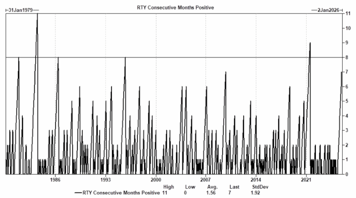 De cara a esta semana, nuestra cesta de Cíclicos / Defensivos (GSPUCYDE) encadenó una racha récord, subiendo durante 14 sesiones consecutivas. De forma similar, el IWM acumula ya más de un 9 % de subida en las últimas 20 sesiones, y va camino de cerrar su octavo mes consecutivo en positivo, una de las rachas más largas registradas.