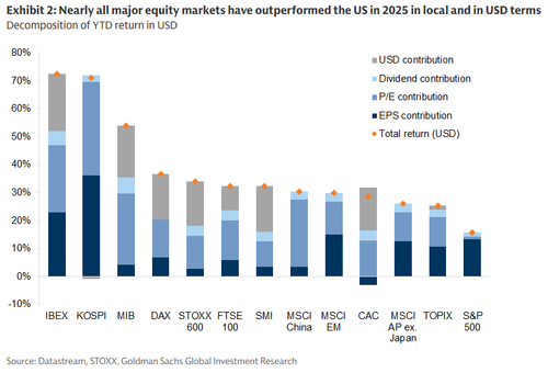 En medio de toda esta locura, Europa logró superar a EE. UU. (en dólares estadounidenses) por tercera vez desde 2010: SXXP +32% en lo que va del año frente al 17% del SPX. Esto siguió a un 2024 en el que Europa quedó un 24% por detrás de EE. UU. (en dólares estadounidenses) y los inversores comenzaron el año con una confianza históricamente baja hacia la región. Aunque, para ser justos, no fue solo Europa: como muestra el siguiente gráfico, prácticamente todos los mercados superaron a EE. UU. en 2025.
