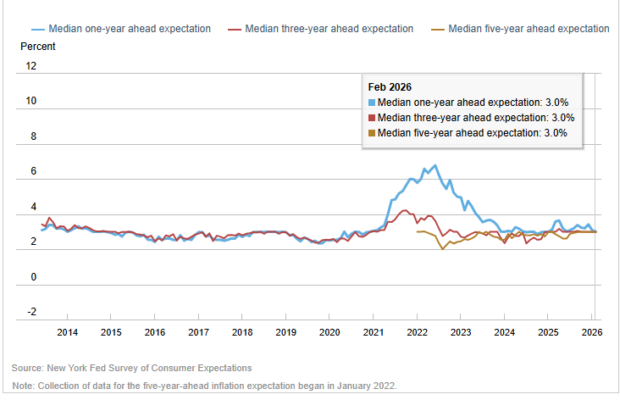 La encuesta de consumidores de la Fed de Nueva York de febrero (que muchos prefieren frente a la de la Universidad de Michigan porque sigue un panel consistente de 1.300 hogares) mostró que las expectativas de inflación a 1 año volvieron a bajar, mientras que las de 3 y 5 años se mantuvieron estables, situándose las tres en el 3,0%.