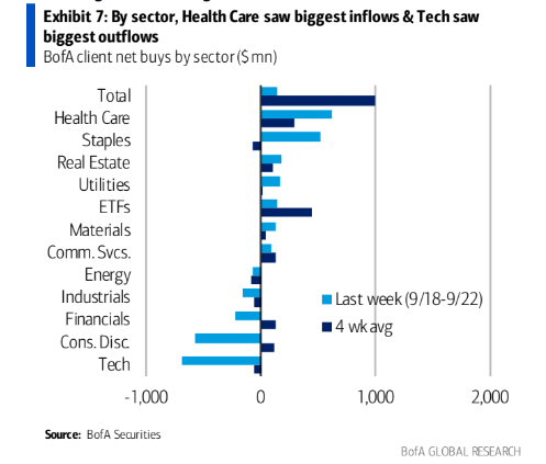 Los clientes compraron acciones en 6 de los 11 sectores del GICS, liderados por el sector de Cuidado de la Salud (tercera semana consecutiva de entradas), Bienes de Consumo Básico (las mayores entradas desde mediados de agosto) y Bienes Raíces.