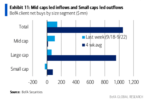 Los clientes compraron acciones de gran y mediana capitalización y vendieron acciones de pequeña capitalización, lo que marcó la primera salida desde finales de junio. Sin embargo, después de flujos extremadamente negativos en la primera mitad del año, las acciones de pequeña capitalización han experimentado entradas en 12 de las últimas 13 semanas.