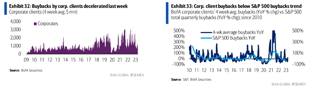 Las recompras de acciones siguen siendo tímidas. Las recompras corporativas de los clientes se desaceleraron la semana pasada y han estado por debajo de las tendencias estacionales todas las semanas desde mayo. En lo que va del año, las recompras de los clientes corporativos como porcentaje de la capitalización de mercado del S&P 500 (0.15%) están por debajo de los máximos de 2022 (0.16%) en este momento.