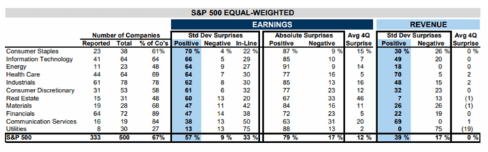 Con el 77% de la capitalización de mercado del S&P 500 habiendo informado los resultados del cuarto trimestre de 2023, las empresas generalmente han superado las expectativas del consenso. El 57% de las firmas del S&P 500 han superado las expectativas de EPS del consenso en más de una desviación estándar de las estimaciones de los analistas, aproximadamente en línea con los dos últimos trimestres y por encima del promedio a largo plazo del 48% (ver página 5). Las ganancias por acción (EPS) del S&P 500 del cuarto trimestre están en camino de crecer un 7% interanual en comparación con las estimaciones de los analistas del 3% al comienzo de la temporada.