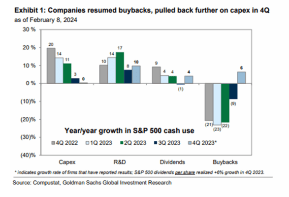 .Las empresas están devolviendo efectivo a los accionistas y reduciendo aún más el gasto en inversiones de capital. Después de un crecimiento negativo interanual durante 5 trimestres consecutivos, las recompras de acciones están aumentando un +6% en el cuarto trimestre, impulsadas por una combinación de crecimiento positivo de las ganancias, un pico en los rendimientos de los bonos y comparaciones más fáciles con el año anterior. Como suele ser históricamente el caso, los dividendos han sido menos volátiles en 2023 y el DPS creció un +6% interanual en el cuarto trimestre. En contraste, el crecimiento interanual del gasto en inversiones de capital del S&P 500 ha disminuido del +11% en el segundo trimestre de 2023 al +3% en el tercer trimestre y se encuentra en el 0% en el cuarto trimestre. La investigación y desarrollo (I+D), que está altamente concentrada en un puñado de acciones de tecnología y farmacéuticas, se mantuvo resiliente en el cuarto trimestre (+10% interanual).