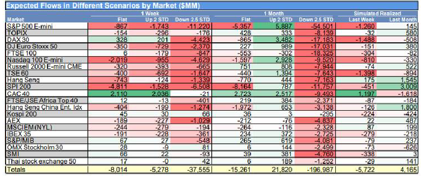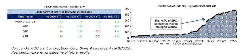 Los CTAs aparecen como vendedores modelados del S&P (futuros) en todos los escenarios esta semana. Las estimaciones van desde −800 M$ en un mercado plano hasta −11.200 M$ en un escenario de fuerte caída. Esto se está viendo contrarrestado por una demanda creciente de recompras corporativas, con el 65 % de las compañías del S&P actualmente en ventana abierta (subiendo al 75 % a final de semana), y nuestra mesa señalando que los niveles de actividad aumentaron un 40 % semana sobre semana la semana pasada, con un repunte de la demanda en tecnología a lo largo de toda la semana.