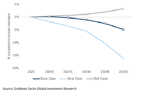 • Gráfico 6: Impacto potencial en el rideshare humano por los robotaxis, con un escenario base de 5% de canibalización/disrupción, y escenarios alternativos con impacto neto positivo en un caso alcista o una canibalización del 16% en un caso bajista.