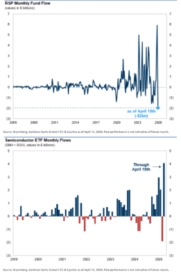 • Semiconductores: SMH + SOXX (los dos mayores ETFs de semiconductores) van camino de su mayor entrada mensual conjunta de la historia. Desde comienzos de abril, más de 4.000 millones de dólares han entrado en el sector, revirtiendo bruscamente las salidas de marzo. Gran parte de este movimiento parece impulsado por el rendimiento… el índice subyacente de SMH va camino de superar al SPX durante 3 semanas consecutivas por más de un 10%.