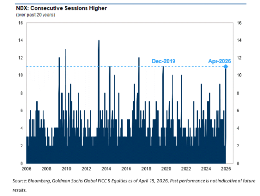 • El NDX ha encadenado 11 sesiones consecutivas al alza, subiendo un +14% (no ocurría desde diciembre de 2019). Si buscamos estadísticas, todas menos una sesión de esta racha coinciden con el inicio de abril, lo que supone el mejor comienzo de mes más prolongado desde julio de 2013 para el índice.
