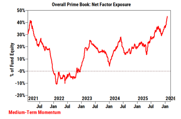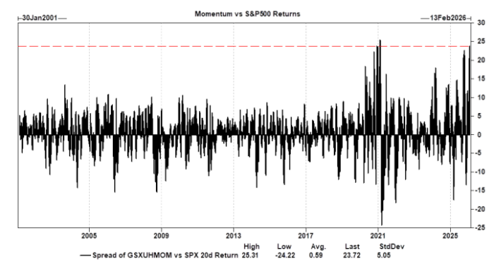 El factor parece estirado. De cara a esta semana, GSXUHMOM había subido durante cinco semanas consecutivas. Nuestro libro PB tiene una exposición neta en el percentil 100, y la cesta cotiza casi un 15% por encima de su media móvil de 50 días.