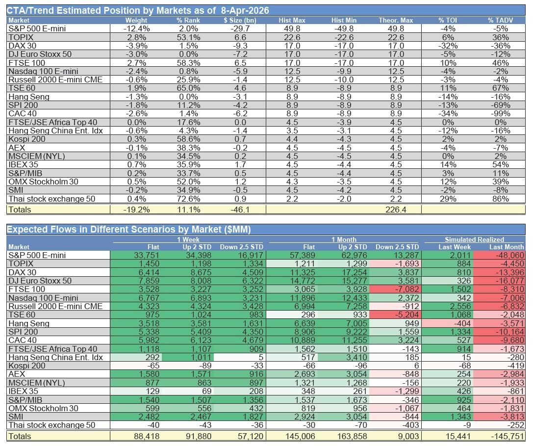 A los niveles actuales del mercado, los CTA comprarán 34.000 millones de dólares del S&P 500 durante la próxima semana (cerrando posiciones cortas y abriendo posiciones largas) … Tras la subida de ayer del S&P 500, los tres umbrales de impulso de los CTA se encuentran en territorio positivo: – corto plazo (>6713), – a medio plazo (>6734) y, – a largo plazo (>6400).