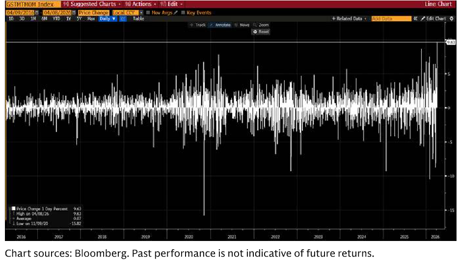 • Fuimos compradores continuos de grandes tecnológicas / semiconductores / infraestructura de IA durante toda la sesión, impulsados principalmente por la comunidad de long-only (LO)… flujos que sugerían un deseo de reconstruir rápidamente exposición neta larga y que confirmaban gran parte de lo que habíamos escuchado durante marzo (en concreto, la intención de volver a entrar en el mismo grupo de posiciones de alta convicción una vez mejorara el entorno de riesgo).