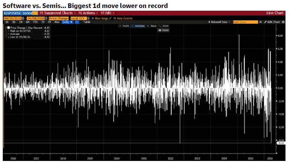 • Por el contrario, vimos otra oleada de ventas en software (combinación de reducciones adicionales por parte de LO + incremento de cortos), que se aceleró a lo largo del día en nuestra mesa (muchos apuntaban al ruido en torno al adelanto de “Claude Mythos” de Anthropic + trading explícito macro/factor).