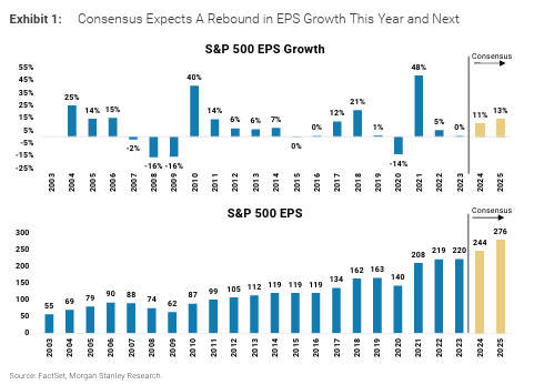 - Grandes Expectativas… Durante los últimos cinco meses, el índice MSCI All Country World ha aumentado ~25% mientras que muchos otros precios de activos han aumentado a cifras de dos dígitos o más. Creemos que este repunte ha sido principalmente debido a condiciones financieras más laxas y una caída en el costo de capital como resultado del cambio moderado de la Fed en el cuarto trimestre. Una mayor expansión de múltiplos en los Estados Unidos probablemente dependa de una inflexión al alza en las expectativas de ganancias para 2024 y 2025, que han estado planas a nivel del S&P desde octubre pasado.