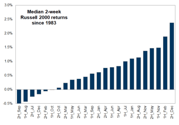 d. Primera mitad de agosto para el Russell 2000 – Desde 1983, la primera mitad de agosto es el segundo peor período de dos semanas del año. (Este gráfico se vuelve importante después del nuevo aumento reciente).