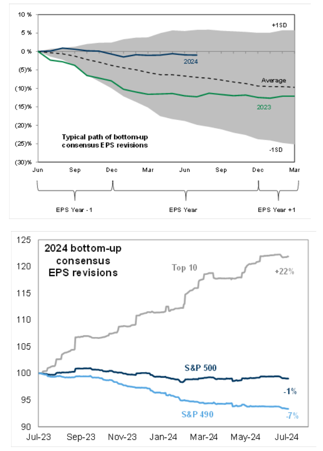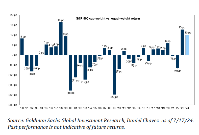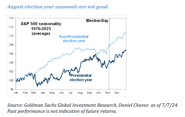 a. Feliz recorrido – Primera mitad de julio: Los primeros 15 días de julio han sido el mejor período de dos semanas de negociación para el S&P desde 1928. Estamos terminando el mejor período de negociación del año. El 2024 ha tenido el 15º mejor comienzo de año registrado.