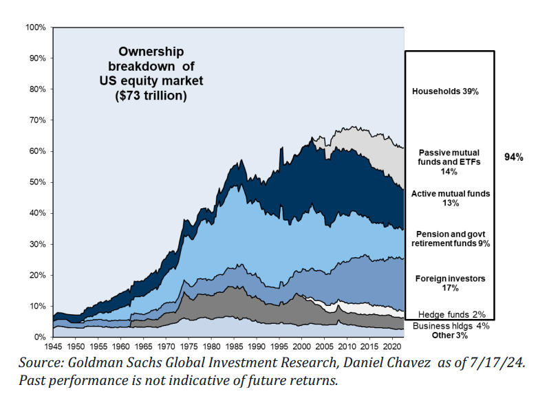 En la primera mitad de 2024, los ETF y los fondos mutuos de acciones vieron las segundas mayores entradas de capital registradas con $231 mil millones. Los fondos pasivos vieron entradas de +$436 mil millones, mientras que los fondos activos vieron salidas de -$205 mil millones. Esto significa entradas pasivas en las empresas de mayor capitalización y con alto impulso. Esto cambia completamente en agosto.