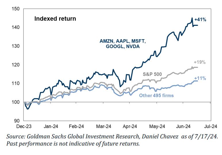 - Cinco acciones han subido un 41%, el listón para esas acciones de cara a las ganancias es notablemente alto. Y por alto, me refiero a que deben ser excelentes. En Megacap Tech, Confiamos.