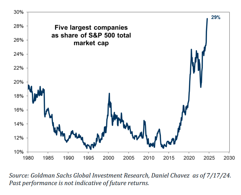 - Si asignas $1 en el ETF del S&P 500, SPY, 29 centavos van a las 5 acciones principales, un nuevo récord.