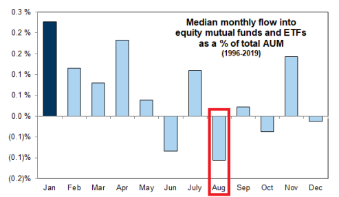 d. Agosto es el mes con las mayores salidas de capital del año desde fondos pasivos y mutuos de acciones. La dinámica más importante aquí es que las entradas pasivas se detendrán a medida que los compradores se queden sin munición. Las entradas pasivas en fondos con fecha objetivo y fondos de jubilación han sido uno de los pilares clave de este movimiento de flujo de fondos hacia acciones. Esto se pausa un poco en agosto.