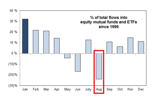 Agosto es el peor mes del año para los flujos de capital en acciones. No se predicen entradas de capital en agosto ya que el capital ya ha sido desplegado para el tercer trimestre. Los compradores se han quedado sin munición y estoy atento a las salidas de capital.