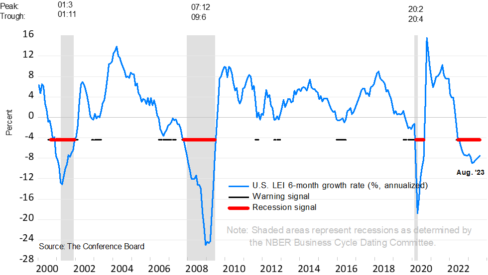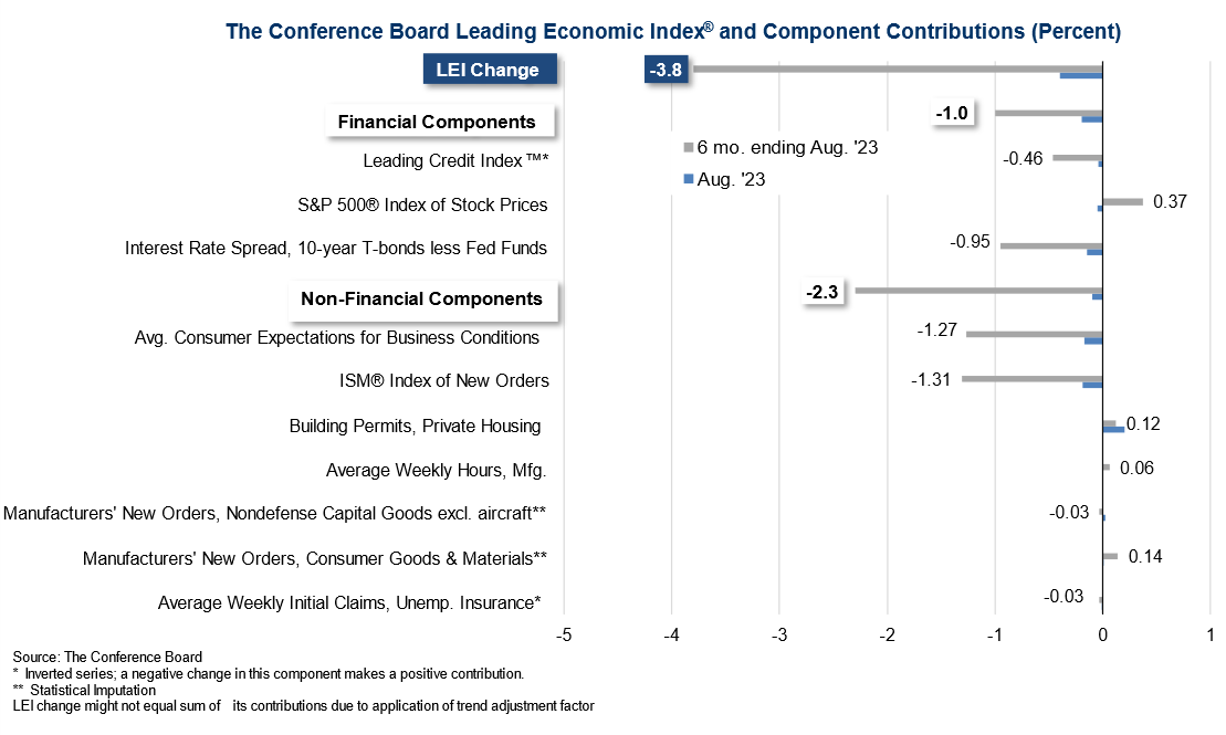 El Índice Líder de la Economía® (LEI, por sus siglas en inglés) de The Conference Board para los Estados Unidos disminuyó un 0.4 por ciento en agosto de 2023 a 105.4 (2016=100), después de una disminución del 0.3 por ciento en julio. El LEI ha caído un 3.8 por ciento durante el período de seis meses entre febrero y agosto de 2023, apenas cambiando desde su contracción del 3.9 por ciento durante los seis meses anteriores (agosto de 2022 a febrero de 2023).