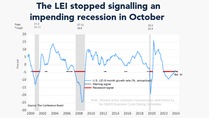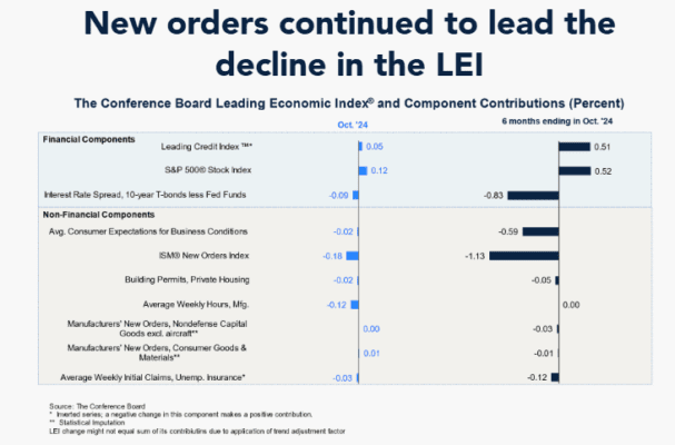 El Índice Líder de la Economía (LEI) del Conference Board para los EE. UU. disminuyó un 0.4% en octubre de 2024, situándose en 99.5 (2016=100), tras una caída del 0.3% en septiembre (revisado al alza desde una caída inicial del 0.5%). Durante el período de seis meses entre abril y octubre de 2024, el LEI cayó un 2.2%, ligeramente más que su disminución del 2.0% en el período anterior de seis meses (octubre de 2023 a abril de 2024).