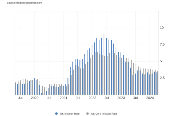 La tasa de inflación anual en EE. UU. se redujo al 3.4% en abril de 2024 desde el 3.5% en marzo, que fue la lectura más alta desde septiembre, en línea con las previsiones del mercado. La inflación se mantuvo estable para los alimentos (2.2%) y se desaceleró para el alojamiento (5.5% frente al 5.7%), mientras que los precios continuaron disminuyendo para los vehículos nuevos (-0.4% frente a -0.1%) y los autos y camiones usados (-6.9% frente a -2.2%).