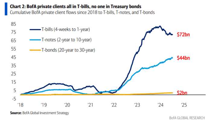 - Los flujos de clientes privados de BofA hacia los bonos del Tesoro son una buena ventana al sentimiento de los inversores sobre bonos. Las entradas en 2022/2023 (Gráfico 2) fueron de $80 mil millones a letras del Tesoro (T-bills), $34 mil millones a notas del Tesoro (T-notes) y solo $1 mil millones a bonos del Tesoro (T-bonds). En 2024, los flujos hacia las letras del Tesoro se han revertido parcialmente ($10 mil millones de salidas), se mantienen estables pero sin grandes aumentos en las notas del Tesoro ($5 mil millones de entrada) y los inversores continúan evitando decididamente el tramo largo (solo $0.5 mil millones de entrada a bonos del Tesoro). Cabe destacar que la posición de BofA en las acciones del Magnificent 7 ahora representa dos tercios de sus participaciones en todos los bonos del Tesoro con una duración de más de 1 año. Esto se refleja también en el lado institucional, donde aún no hay evidencia (según el FMS de BofA) de que los clientes estén vendiendo acciones para comprar bonos.