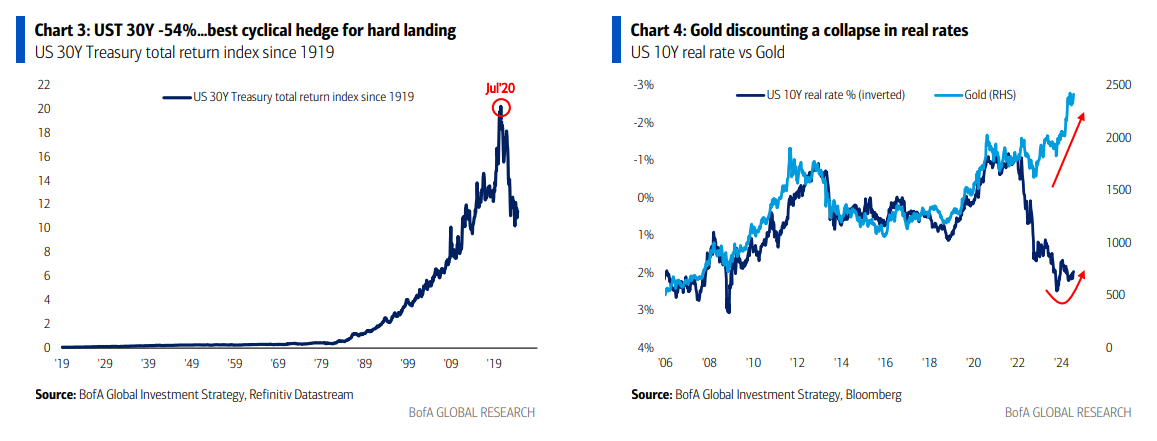 - Las expectativas de un “aterrizaje suave” están en aumento, ya que el consenso espera que cualquier desaceleración en EE. UU. sea “transitoria” ya que los recortes de tasas funcionarán rápidamente y con fuerza (a pesar de que los aumentos de tasas tienen un impacto negativo lento y en gran medida impotente). Nosotros decimos “vender el primer recorte de tasas” para crédito y acciones ya que las probabilidades de un aterrizaje duro aumentarán dado la trayectoria del mercado laboral de EE. UU., el gasto del consumidor y el gasto de capital. El bono del Tesoro a 30 años es la mejor cobertura cíclica para un aterrizaje duro (Gráfico 3); suave = rendimientos >4%, duro = rendimientos <4%.