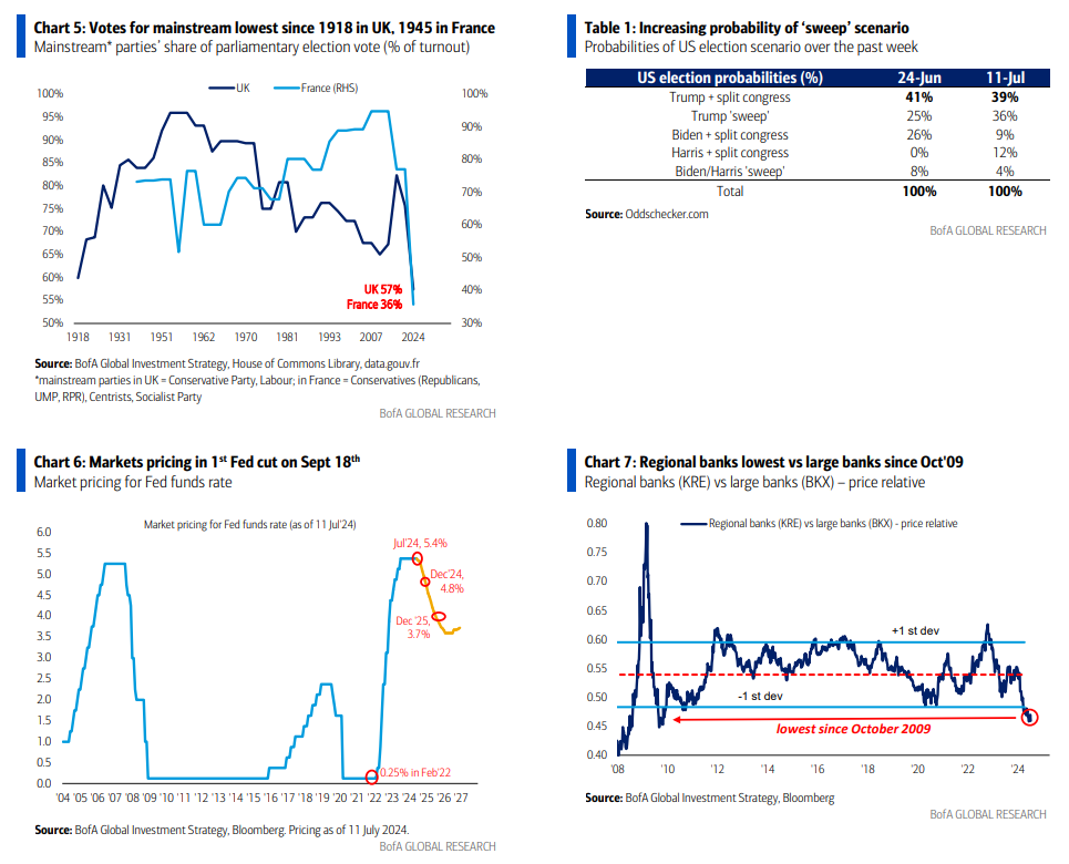 - En las elecciones recientes, el porcentaje del electorado que vota por partidos tradicionales cayó al nivel más bajo desde 1918 en el Reino Unido (57%) y al más bajo desde 1945 en Francia (36% – Gráfico 5). La desconfianza electoral en la política tradicional se refleja en la desconfianza de los inversores de que se implementen políticas fiscales y monetarias convencionales, una gran razón para la “huelga de compradores” en bonos gubernamentales en los últimos años (los inversores no quieren prestar a políticos occidentales). Desde una perspectiva cíclica del segundo semestre, los optimistas de los bonos están encantados de que los bonos estén subiendo a pesar de las preocupaciones del consenso sobre un posible “barrido” en las elecciones de EE. UU. en las últimas semanas (las últimas probabilidades son: Trump y Congreso dividido 39%, barrido de Trump 36%, Biden o Harris y Congreso dividido 21%, barrido de Biden/Harris 4% – Tabla 1).