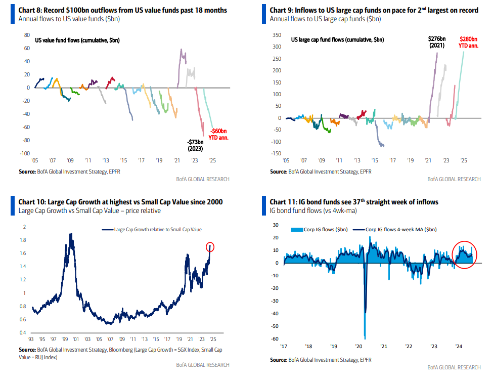 - Las entradas en fondos de gran capitalización de EE. UU. están anualizando la segunda más grande registrada (Gráfico 9), y las acciones de crecimiento de gran capitalización están en el nivel más alto frente a las de valor de pequeña capitalización desde julio de 2000 (Gráfico 10).