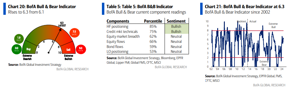 - Largo en activos con “apalancamiento” como los REITs (según el BofA FMS de mayo de 2024, la subponderación más alta desde junio de 2009), acciones de pequeña capitalización, bancos regionales (KRE vs BKX más bajo desde octubre de 2009 – Gráfico 7).