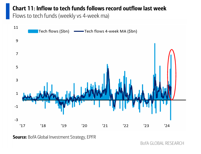 • Tecnología: entrada de $6.8 mil millones, recuperación de la salida récord de $4.4 mil millones de la semana pasada (Gráfico 11).