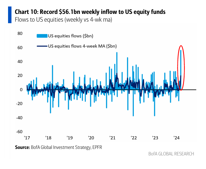 • Acciones de EE.UU.: entrada semanal récord de $56.1 mil millones (el récord anterior fue de $53.0 mil millones en Mar’21 – Gráfico 10);