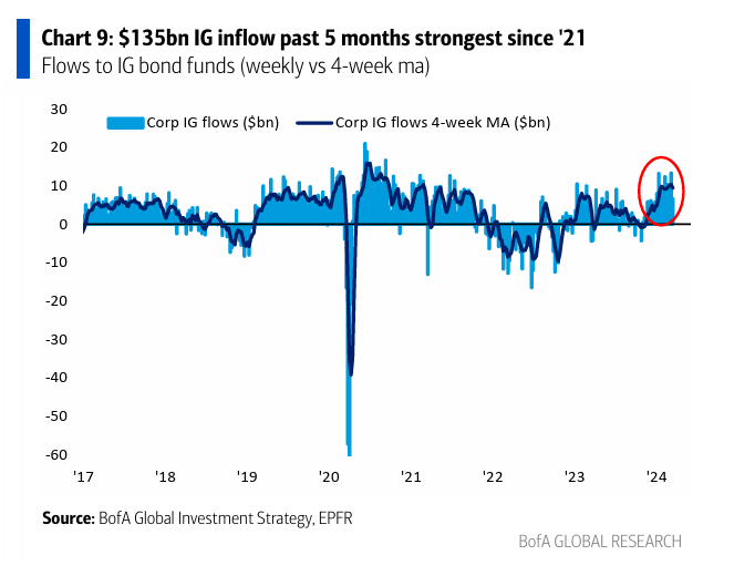 • Bonos IG (Grado de Inversión): entrada de $6.6 mil millones (Gráfico 9)… $135 mil millones en entradas de IG en los últimos 5 meses, la cifra más alta desde ’21;