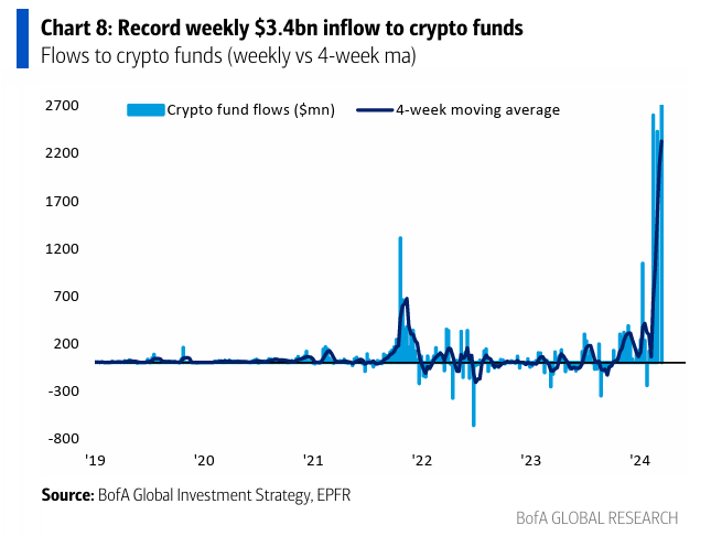 • Cripto: entrada semanal récord de $3.4 mil millones a fondos de criptomonedas (Gráfico 8)… anualizando $54 mil millones YTD;