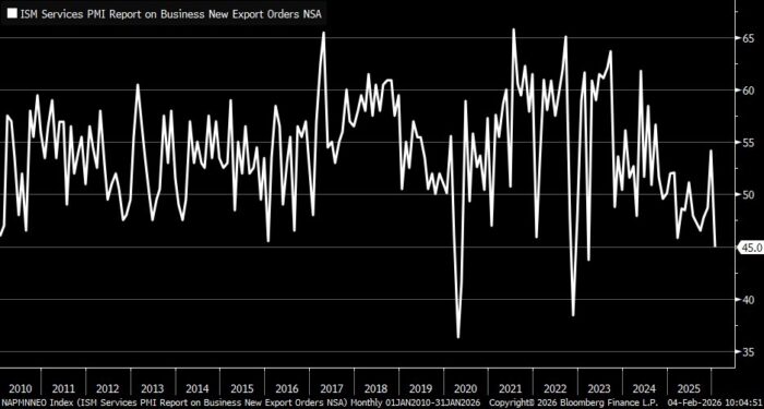 Los nuevos pedidos de exportación del ISM de Servicios cayeron con fuerza en enero, hasta su nivel más bajo desde marzo de 2023. Vía Kevin Gordon