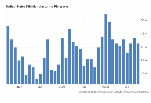 El PMI manufacturero de EE. UU. (ISM) cayó a 48,7 en octubre de 2025 desde 49,1 en septiembre, por debajo de las previsiones del mercado (49,5), lo que indica ocho meses consecutivos de contracción en el sector manufacturero.