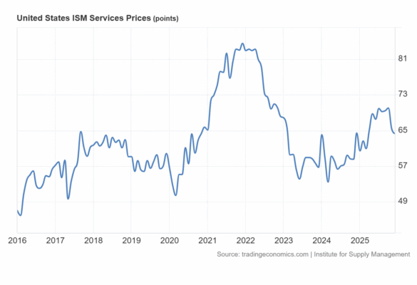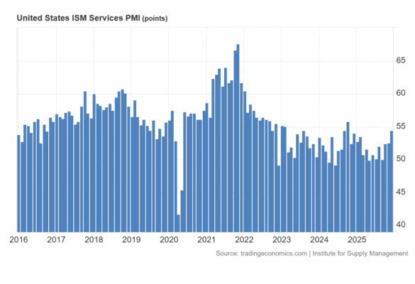 El ISM de servicios de Estados Unidos aumentó por tercer mes consecutivo hasta 54,4 en diciembre de 2025, desde 52,6 en noviembre, muy por encima de las previsiones de 52,3.