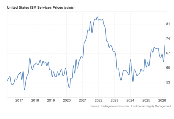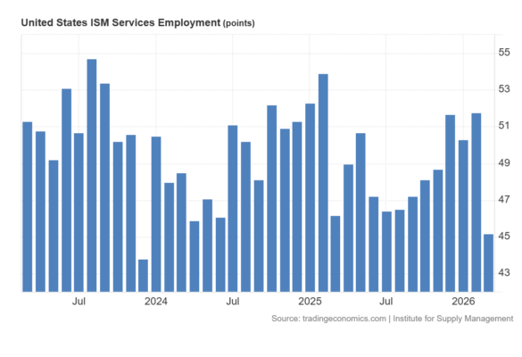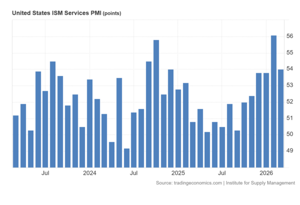 El PMI de servicios del Institute for Supply Management cayó a 54 en marzo de 2026, desde 56,1 en febrero (que había sido el nivel más alto desde agosto de 2022), y por debajo de las previsiones de 55.