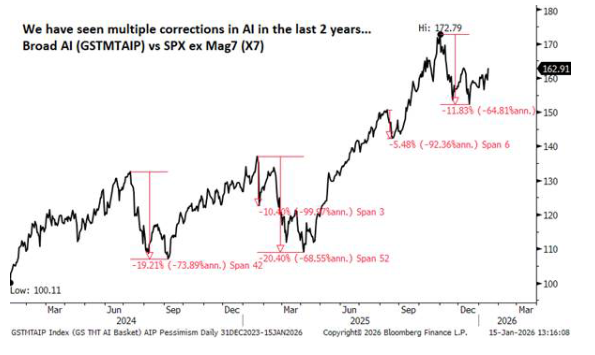 Hemos visto múltiples correcciones en el ecosistema de IA. La última duró algo más de 30 días, durante los cuales nuestra cesta Broad AI (GSTMTAIP) infrarendió al S&P 500 excluyendo las “Mag 7” (X7) en aproximadamente 12 puntos porcentuales. No es la peor corrección de los últimos dos años y aún no se ha recuperado completamente.