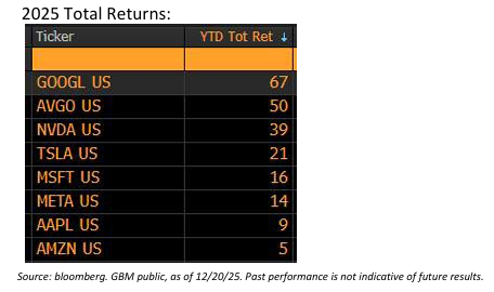 Tras la conferencia, GOOGL sube otro 35 % hasta el cierre del año y se perfila para terminar como el gran ganador del ejercicio (+67 % de rentabilidad total, añade 1,5 billones de dólares a su capitalización y rebota un +120 % desde el mínimo de abril, pasando de ser “el que más tenía que perder con la IA” a “el que más tiene que ganar” a ojos de muchos inversores).