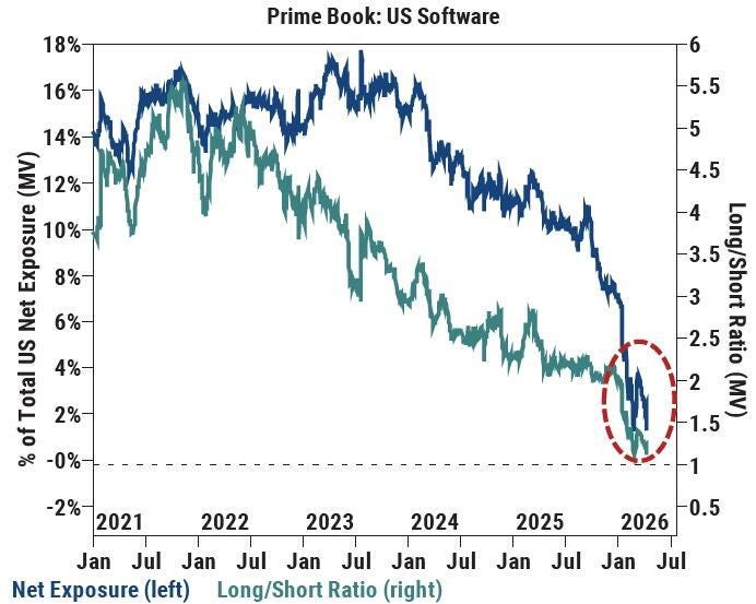 La exposición neta al sector del software se ha desplomado hasta situarse en tan solo el 1,4% del total neto de EE. UU., frente al 7% de principios de año, mientras que la relación agregada de posiciones largas/cortas ha vuelto a caer a 1,14 frente a 2,0 a principios de enero; esencialmente, un regreso completo a los mínimos históricos que vimos a finales de febrero.