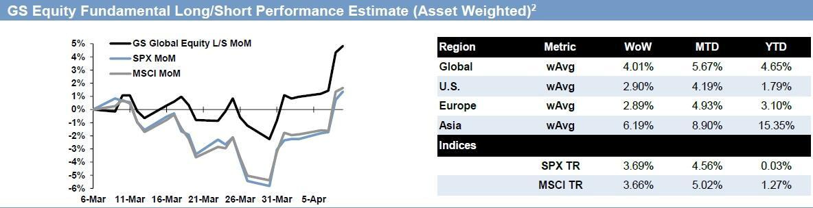 Tras los titulares iniciales sobre el alto el fuego, nuestro equipo observó una fuerte demanda para cubrir posiciones cortas y deshacer coberturas , pero también se detectó cierta actividad ofensiva. Nuestros datos de PB revelaron el mismo cambio: las acciones globales registraron compras netas por primera vez en 8 semanas, mientras que nuestra estimación de rendimiento fundamental de GS Equity L/S aumentó un +4,01%… El mejor rendimiento semanal desde febrero de 2021.
