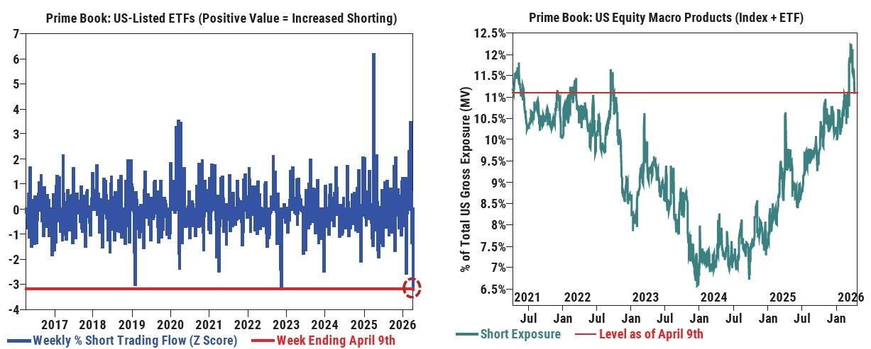 El movimiento más significativo se observó en los productos macroeconómicos. Los fondos de cobertura compraron exposición neta a índices y ETF al ritmo más rápido desde mayo de 2025 (+2,2 DE frente a 1 año), impulsado principalmente por la cobertura de posiciones cortas . Las posiciones cortas en ETF que cotizan en EE. UU. disminuyeron un -11,5 % en la semana, el mayor porcentaje de cobertura semanal en la última década (-3,2 de puntuación z). Se compraron productos macroeconómicos en todas las regiones, lideradas por Europa y Asia desarrollada, y ahora representan el 9,9 % de la exposición bruta global total, lo que se sitúa en el percentil 97 en comparación con los últimos 5 años.