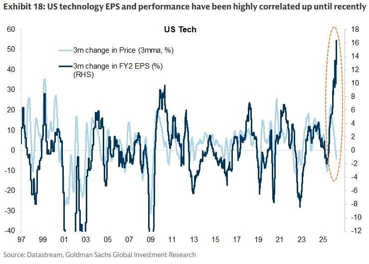 En definitiva, esto ha generado recientemente una brecha récord entre el rendimiento de las empresas tecnológicas estadounidenses y el crecimiento de sus beneficios subyacentes.