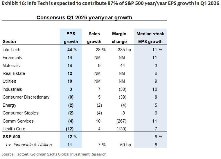 Se prevé que, por debajo del índice, la acción mediana aumente sus ganancias por acción (EPS) en un 8%, mientras que se espera que el sector de tecnología de la información (Info Tech) por sí solo aumente sus EPS en un 44% y represente el 87% del crecimiento total de las EPS del índice en el primer trimestre.
