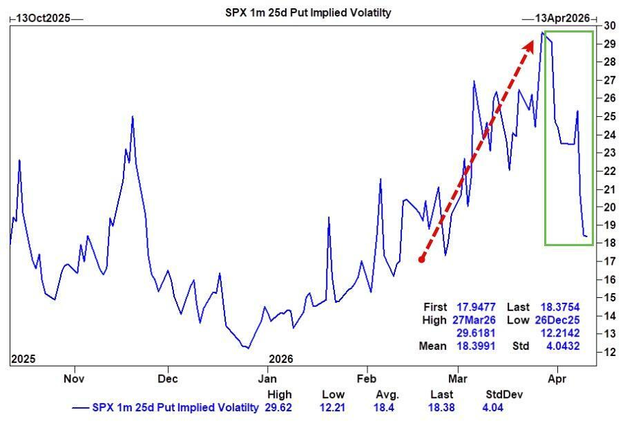 Dicho esto, las conversaciones entre Estados Unidos e Irán durante el fin de semana y la aversión al riesgo observada anoche nos recuerdan que aún nos encontramos en una fase de reasignación de riesgos frágil, no en una tendencia alcista lineal . De hecho, refuerza la idea de que ahora existen coberturas disponibles con niveles de protección implícita mucho más bajos que las elevadas primas propias del pánico que vimos hace varias semanas. El siguiente gráfico ilustra de forma sencilla cómo las opciones de venta del S&P se han reajustado a un nivel de volatilidad implícita acorde con el promedio de los últimos seis meses.
