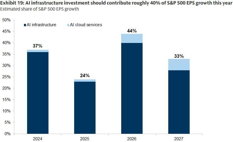 Nuestros estrategas también estiman que el gasto en inversión en IA impulsará aproximadamente el 40% del crecimiento total de las ganancias por acción del S&P este año y, lo que es importante, esas estimaciones han aumentado en las últimas semanas a pesar de la volatilidad.