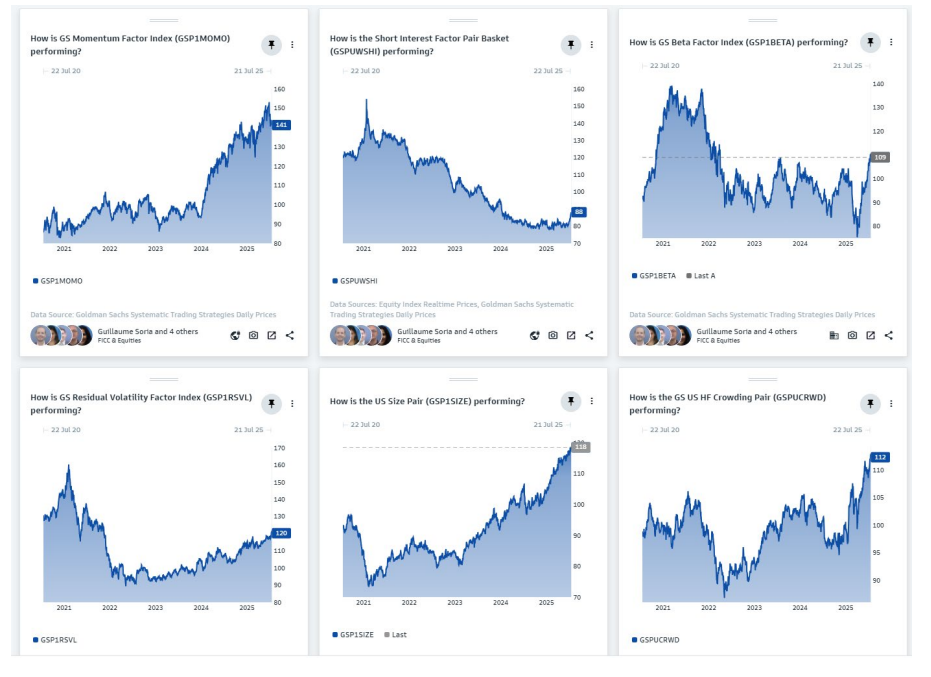 • Largo en acciones expuestas al riesgo geopolítico (GSXUGEOP) o en el factor petróleo (GSPUOILY), dado que las tensiones geopolíticas siguen siendo un factor dominante en el mercado.